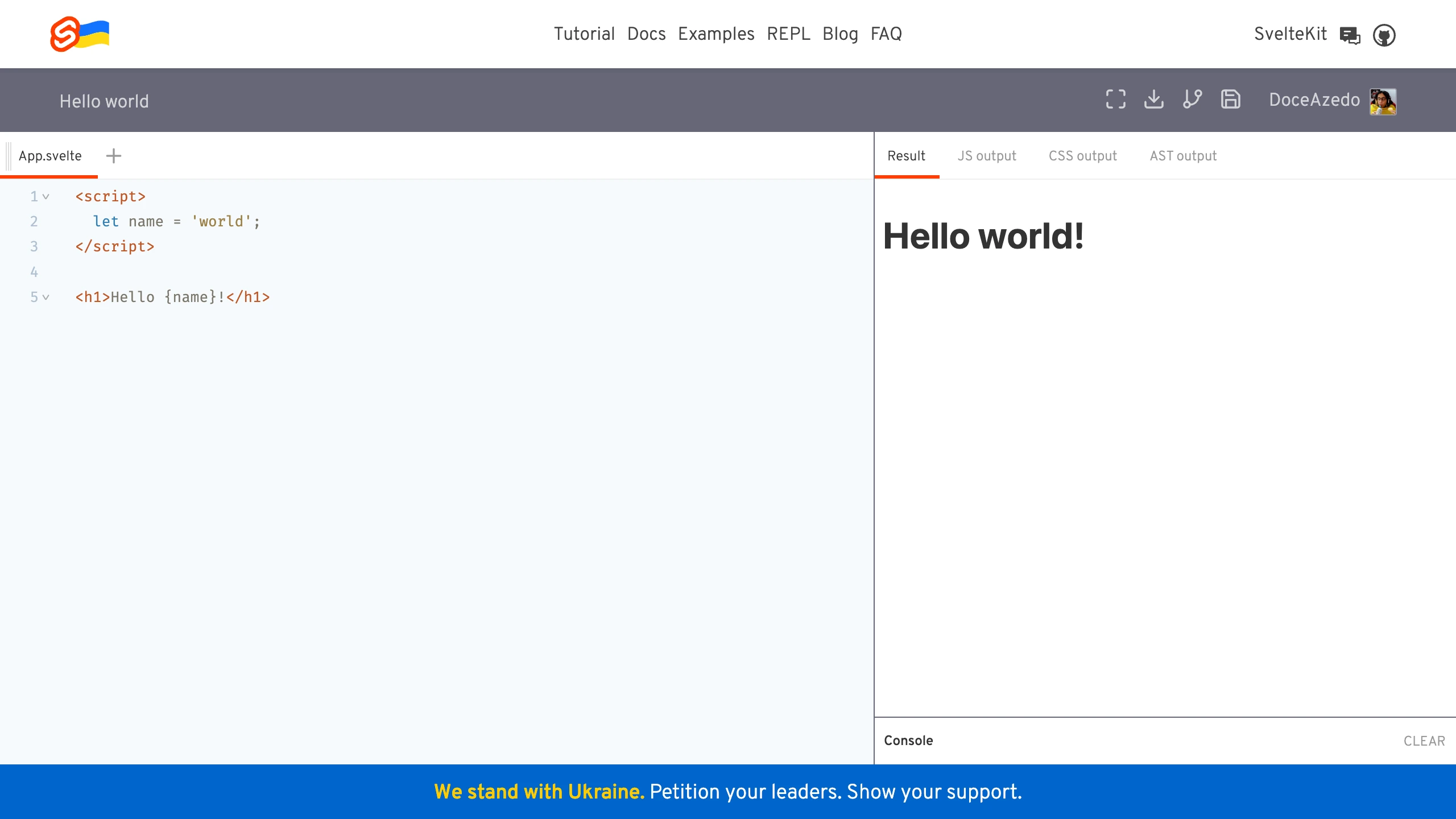 Before installing anything, go to the REPL. It’s an online editor where you can play with Svelte code.