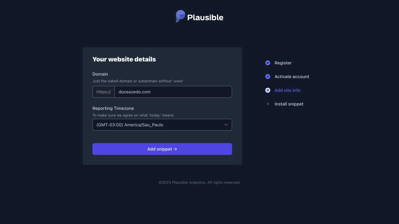 Next you will enter your site’s domain. In my case that was doceazedo.com. You also choose your timezone so your traffic reports are shown using the correct time reference.