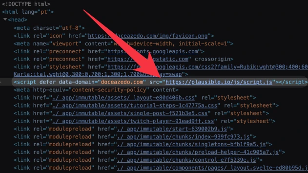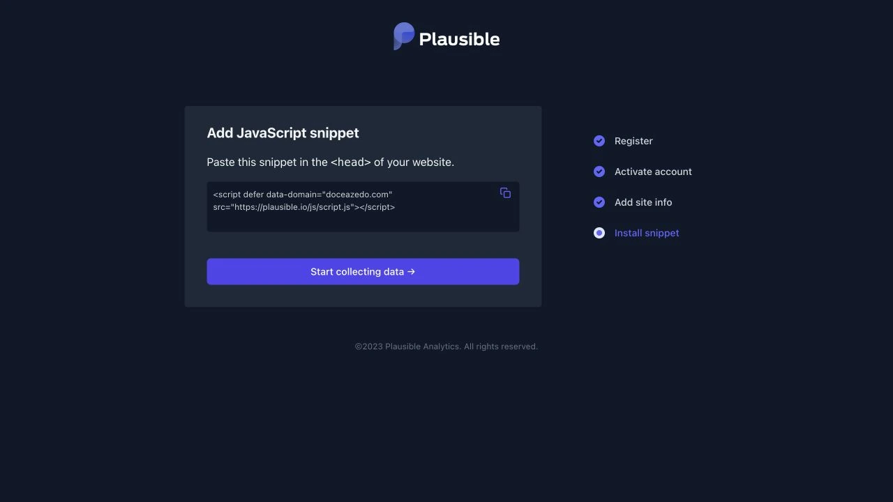 Once you finish setting up your account and site, Plausible gives you a script tag to include in your website. This script goes into your <head> tag.